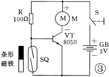 在磁力自动控制电路中,传感元件是干簧管,当磁铁靠近时,常开触点闭合而接通传感电路,完成位置传感作用。 能不能用干簧管开关直接控制电动机的转与停呢?玩具电动机是常用的动力装置,它能够把电能转换为机械能,可用于小电风扇转动、小离心水泵抽水等执行功能。通常玩具直流电动机工作电压低,虽然在1.5~3V就可以启动,但起动电流较大(1~2安培),如果用触点负荷仅为几十毫安的干簧管进行开关控制,将大大缩短其使用寿命。因此,在自动控制电路中,常使用电子开关来控制电动机的工作状态。